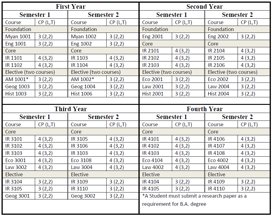 Students who passed second year with GPA ≥ 4 are eligible to attend B.A. (Honours) classes for three more years. After they finished successfully, they earned B.A. (Hons) degree in International Relations Major.