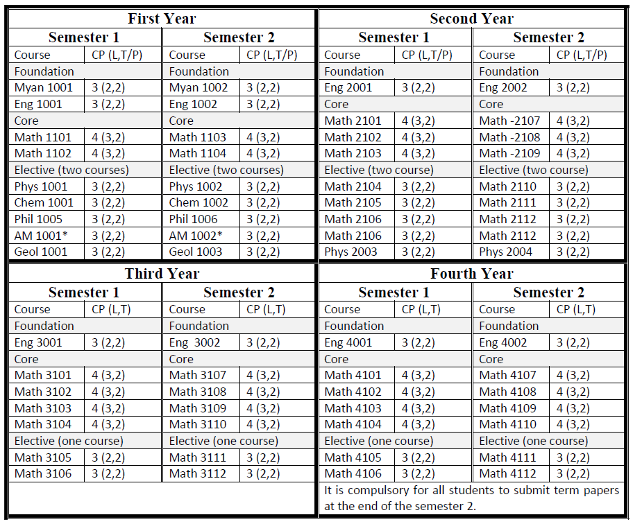 Students who passed second year with GPA ≥4 are eligible to attend B.Sc. (Honours) classes for three more years. After finished successfully, they are earned B.Sc. (Hons) degree majoring in Mathematics.